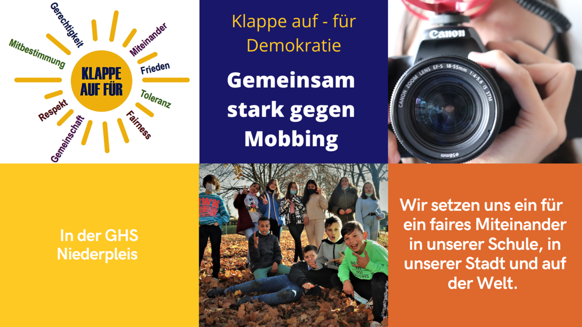 Die Schülergruppe „Klappe auf – für Demokratie“ der Gemeinschaftshauptschule Niederpleis engagiert sich für einen gewaltfreien und respektvollen Umgang miteinander. Ausgehend von eigenen Erfahrungen mit Mobbing und Gewalt in der Schule wie im privaten Umfeld sollen mit dem Projekt von Mobbing betroffene Jugendliche beraten und gestärkt werden: Wie verhält man sich in einer solchen Situation? Wo bekommt man Hilfe? Und wie setzt man das Recht auf Gewaltfreiheit und respektvollen Umgang durch?