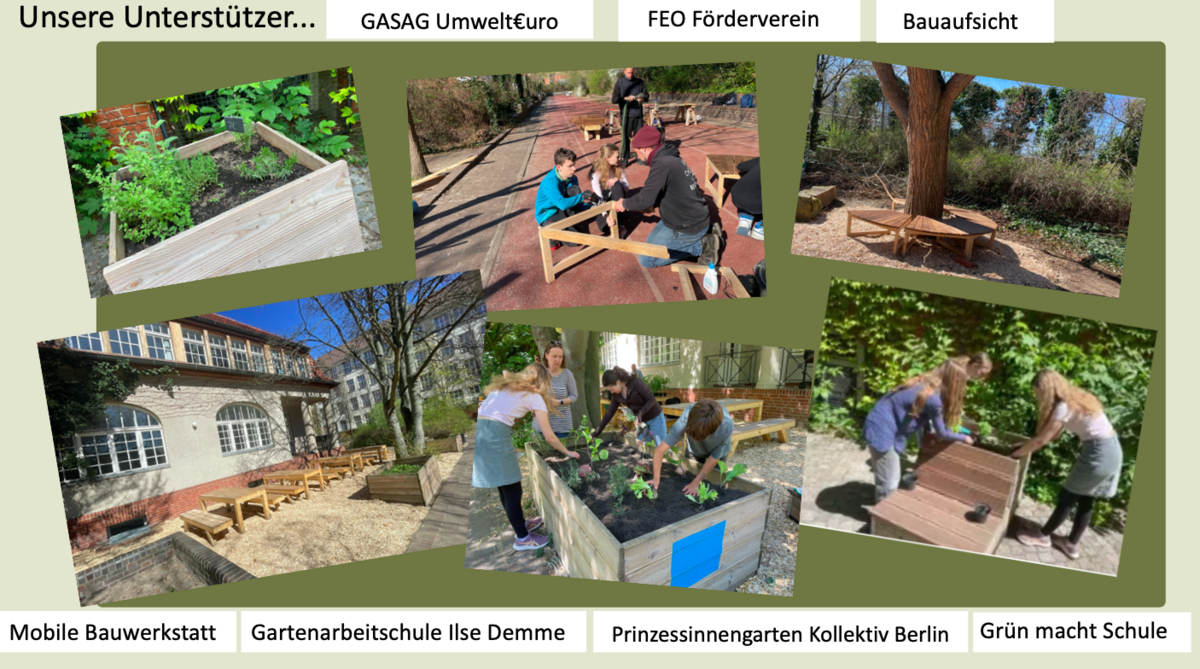 Im FEO Klimaparlament des Friedrich-Ebert-Gymnasiums in Berlin entscheiden Schüler:innen aktiv über ökologische Verbesserungen in ihrer Schulumgebung. Nicht nur über Nachhaltigkeit sprechen, sondern Verantwortung übernehmen und zeigen, dass Jugendliche wirksame Veränderungen anstoßen können, war die Motivation für die Einberufung eines Gremiums, in das jede Klasse zwei gewählte Vertreter:innen entsendet. Damit sollten ökologische Veränderungen sichtbar, neue Lernräume geschaffen und Verantwortung dauerhaft in der Schülerschaft verankert werden. In demokratischen Prozessen fällt der Rat Entscheidungen, tritt mit Behörden in Dialog, stellt Anträge und organisiert Aktionen. So wurden zusätzliche Sitzgelegenheiten gebaut, Pflanzflächen angelegt, Entsiegelungen vorgenommen, Pflegepatenschaften für Beete initiiert und ein grünes Klassenzimmer eingerichtet, das Lernen im Freien ermöglicht. Das wirkt auch auf das kulturelle Schulleben: Feste und Veranstaltungen finden in den neu geschaffenen Aufenthaltsbereichen statt. Mindestens einmal im Monat trifft sich der Rat, berät über Projektstände, fasst Beschlüsse und plant weitere Schritte. Als dauerhaft etabliertes Gremium will sich das FEO Klimaparlament zukünftig für Solarpaneele, mehr schattenspendende Bepflanzung und eine Erweiterung des grünen Klassenzimmers einsetzen.